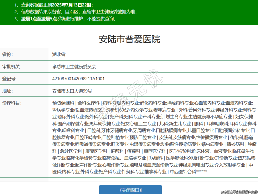 省份:湖北省審批機(jī)關(guān):孝感市衛(wèi)生健康委員會登記號:42108700142098211A1001地址:安陸市太白大道99號診療科目:預(yù)防保健科 | 全科醫(yī)療科 | 內(nèi)科;呼吸內(nèi)科專業(yè);消化內(nèi)科專業(yè);神經(jīng)內(nèi)科專業(yè);心血管內(nèi)科專業(yè);血液內(nèi)科專業(yè);腎病學(xué)專業(yè)(設(shè)血液透析室,透析機(jī)60臺);內(nèi)分泌專業(yè);老年病專業(yè) | 外科;普通外科專業(yè);神經(jīng)外科專業(yè);骨科專業(yè);泌尿外科專業(yè);胸外科專業(yè) | 婦產(chǎn)科;婦科專業(yè);產(chǎn)科專業(yè);計(jì)劃生育專業(yè);生殖健康與不孕癥專業(yè) | 婦女保健科;圍產(chǎn)期保健專業(yè);更年期保健專業(yè);婦女心理衛(wèi)生專業(yè) | 兒科;新生兒專業(yè) | 眼科 | 耳鼻咽喉科;耳科專業(yè);鼻科專業(yè);咽喉科專業(yè) | 口腔科;牙體牙髓病專業(yè);牙周病專業(yè);口腔粘膜病專業(yè);兒童口腔專業(yè);口腔頜面外科專業(yè);口腔修復(fù)專業(yè);口腔正畸專業(yè);口腔種植專業(yè);預(yù)防口腔專業(yè) | 皮膚科;皮膚病專業(yè);性傳播疾病專業(yè) | 傳染科;腸道傳染病專業(yè);呼吸道傳染病專業(yè);肝炎專業(yè);蟲媒傳染病專業(yè);動物源性傳染病專業(yè);蠕蟲病專業(yè) | 結(jié)核病科 | 腫瘤科 | 急診醫(yī)學(xué)科 | 康復(fù)醫(yī)學(xué)科 | 麻醉科 | 疼痛科 | 重癥醫(yī)學(xué)科 | 醫(yī)學(xué)檢驗(yàn)科;臨床體液、血液專業(yè);臨床微生物學(xué)專業(yè);臨床化學(xué)檢驗(yàn)專業(yè);臨床免疫、血清學(xué)專業(yè) | 病理科 | 醫(yī)學(xué)影像科;X線診斷專業(yè);CT診斷專業(yè);磁共振成像診斷專業(yè);超聲診斷專業(yè);心電診斷專業(yè);腦電及腦血流圖診斷專業(yè);神經(jīng)肌肉電圖專業(yè);介入放射學(xué)專業(yè) | 中醫(yī)科;內(nèi)科專業(yè);外科專業(yè);婦產(chǎn)科專業(yè);針灸科專業(yè);推拿科專業(yè) | 中西醫(yī)結(jié)合科******級別:三級法定代表人:徐劍主要負(fù)責(zé)人:執(zhí)業(yè)許可證有效期:2012/03/02 -至- 2027/03/01 -