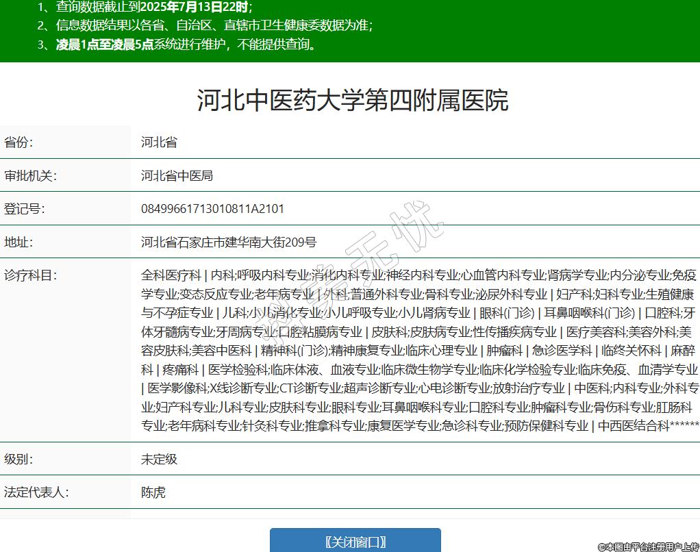 省份:河北省審批機(jī)關(guān):河北省中醫(yī)局登記號:08499661713010811A2101地址:河北省石家莊市建華南大街209號診療科目:全科醫(yī)療科 | 內(nèi)科;呼吸內(nèi)科專業(yè);消化內(nèi)科專業(yè);神經(jīng)內(nèi)科專業(yè);心血管內(nèi)科專業(yè);腎病學(xué)專業(yè);內(nèi)分泌專業(yè);免疫學(xué)專業(yè);變態(tài)反應(yīng)專業(yè);老年病專業(yè) | 外科;普通外科專業(yè);骨科專業(yè);泌尿外科專業(yè) | 婦產(chǎn)科;婦科專業(yè);生殖健康與不孕癥專業(yè) | 兒科;小兒消化專業(yè);小兒呼吸專業(yè);小兒腎病專業(yè) | 眼科(門診) | 耳鼻咽喉科(門診) | 口腔科;牙體牙髓病專業(yè);牙周病專業(yè);口腔粘膜病專業(yè) | 皮膚科;皮膚病專業(yè);性傳播疾病專業(yè) | 醫(yī)療美容科;美容外科;美容皮膚科;美容中醫(yī)科 | 精神科(門診);精神康復(fù)專業(yè);臨床心理專業(yè) | 腫瘤科 | 急診醫(yī)學(xué)科 | 臨終關(guān)懷科 | 麻醉科 | 疼痛科 | 醫(yī)學(xué)檢驗科;臨床體液、血液專業(yè);臨床微生物學(xué)專業(yè);臨床化學(xué)檢驗專業(yè);臨床免疫、血清學(xué)專業(yè) | 醫(yī)學(xué)影像科;X線診斷專業(yè);CT診斷專業(yè);超聲診斷專業(yè);心電診斷專業(yè);放射治療專業(yè) | 中醫(yī)科;內(nèi)科專業(yè);外科專業(yè);婦產(chǎn)科專業(yè);兒科專業(yè);皮膚科專業(yè);眼科專業(yè);耳鼻咽喉科專業(yè);口腔科專業(yè);腫瘤科專業(yè);骨傷科專業(yè);肛腸科專業(yè);老年病科專業(yè);針灸科專業(yè);推拿科專業(yè);康復(fù)醫(yī)學(xué)專業(yè);急診科專業(yè);預(yù)防保健科專業(yè) | 中西醫(yī)結(jié)合科******級別:未定級法定代表人:陳虎主要負(fù)責(zé)人:執(zhí)業(yè)許可證有效期:2022/06/16 -至- 2030/03/22 -
