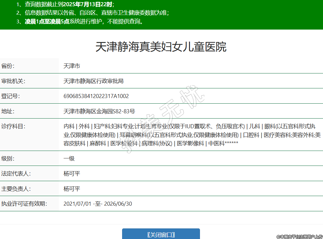 天津靜海真美婦女兒童醫(yī)院,診療科目:內(nèi)科 | 外科 | 婦產(chǎn)科;婦科專業(yè);計(jì)劃生育專業(yè)(僅限于IUD置取術(shù)、負(fù)壓吸宮術(shù)) | 兒科 | 眼科(以五官科形式執(zhí)業(yè),僅限健康體檢使用) | 耳鼻咽喉科(以五官科形式執(zhí)業(yè),僅限健康體檢使用) | 口腔科 | 醫(yī)療美容科;美容外科;美容皮膚科 | 麻醉科 | 醫(yī)學(xué)檢驗(yàn)科 | 病理科(協(xié)議) | 醫(yī)學(xué)影像科 | 中醫(yī)科******