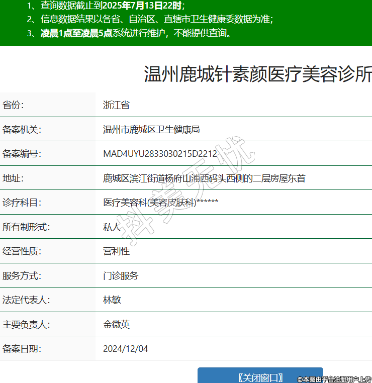 省份:浙江省備案機(jī)關(guān):溫州市鹿城區(qū)衛(wèi)生健康局備案編號(hào):MAD4UYU2833030215D2212地址:鹿城區(qū)濱江街道楊府山浦西碼頭西側(cè)的二層房屋東首診療科目:醫(yī)療美容科(美容皮膚科)******所有制形式:私人經(jīng)營(yíng)性質(zhì):營(yíng)利性服務(wù)方式:門診服務(wù)法定代表人:林敏主要負(fù)責(zé)人:金微英備案日期:2024/12/04 -