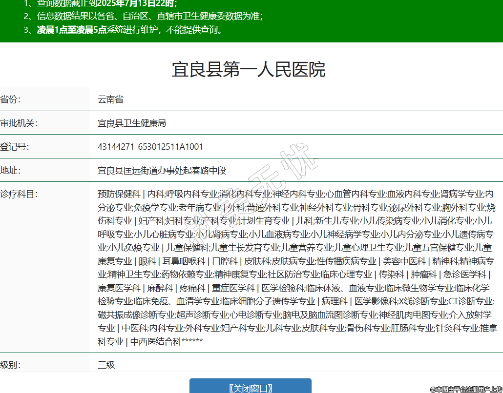 省份:云南省審批機關(guān):宜良縣衛(wèi)生健康局登記號:43144271-653012511A1001地址:宜良縣匡遠街道辦事處起春路中段診療科目:預(yù)防保健科 | 內(nèi)科;呼吸內(nèi)科專業(yè);消化內(nèi)科專業(yè);神經(jīng)內(nèi)科專業(yè);心血管內(nèi)科專業(yè);血液內(nèi)科專業(yè);腎病學(xué)專業(yè);內(nèi)分泌專業(yè);免疫學(xué)專業(yè);老年病專業(yè) | 外科;普通外科專業(yè);神經(jīng)外科專業(yè);骨科專業(yè);泌尿外科專業(yè);胸外科專業(yè);燒傷科專業(yè) | 婦產(chǎn)科;婦科專業(yè);產(chǎn)科專業(yè);計劃生育專業(yè) | 兒科;新生兒專業(yè);小兒傳染病專業(yè);小兒消化專業(yè);小兒呼吸專業(yè);小兒心臟病專業(yè);小兒腎病專業(yè);小兒血液病專業(yè);小兒神經(jīng)病學(xué)專業(yè);小兒內(nèi)分泌專業(yè);小兒遺傳病專業(yè);小兒免疫專業(yè) | 兒童保健科;兒童生長發(fā)育專業(yè);兒童營養(yǎng)專業(yè);兒童心理衛(wèi)生專業(yè);兒童五官保健專業(yè);兒童康復(fù)專業(yè) | 眼科 | 耳鼻咽喉科 | 口腔科 | 皮膚科;皮膚病專業(yè);性傳播疾病專業(yè) | 美容中醫(yī)科 | 精神科;精神病專業(yè);精神衛(wèi)生專業(yè);藥物依賴專業(yè);精神康復(fù)專業(yè);社區(qū)防治專業(yè);臨床心理專業(yè) | 傳染科 | 腫瘤科 | 急診醫(yī)學(xué)科 | 康復(fù)醫(yī)學(xué)科 | 麻醉科 | 疼痛科 | 重癥醫(yī)學(xué)科 | 醫(yī)學(xué)檢驗科;臨床體液、血液專業(yè);臨床微生物學(xué)專業(yè);臨床化學(xué)檢驗專業(yè);臨床免疫、血清學(xué)專業(yè);臨床細胞分子遺傳學(xué)專業(yè) | 病理科 | 醫(yī)學(xué)影像科;X線診斷專業(yè);CT診斷專業(yè);磁共振成像診斷專業(yè);超聲診斷專業(yè);心電診斷專業(yè);腦電及腦血流圖診斷專業(yè);神經(jīng)肌肉電圖專業(yè);介入放射學(xué)專業(yè) | 中醫(yī)科;內(nèi)科專業(yè);外科專業(yè);婦產(chǎn)科專業(yè);兒科專業(yè);皮膚科專業(yè);骨傷科專業(yè);肛腸科專業(yè);針灸科專業(yè);推拿科專業(yè) | 中西醫(yī)結(jié)合科******級別:三級法定代表人:范力主要負責(zé)人:范力執(zhí)業(yè)許可證有效期:2025/06/11 -至- 2038/10/09 -
