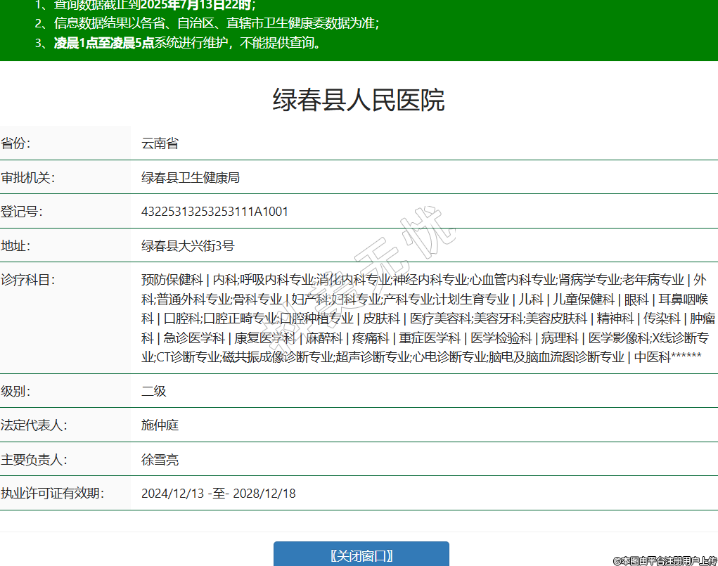 省份:云南省審批機關(guān):綠春縣衛(wèi)生健康局登記號:43225313253253111A1001地址:綠春縣大興街3號診療科目:預(yù)防保健科 | 內(nèi)科;呼吸內(nèi)科專業(yè);消化內(nèi)科專業(yè);神經(jīng)內(nèi)科專業(yè);心血管內(nèi)科專業(yè);腎病學(xué)專業(yè);老年病專業(yè) | 外科;普通外科專業(yè);骨科專業(yè) | 婦產(chǎn)科;婦科專業(yè);產(chǎn)科專業(yè);計劃生育專業(yè) | 兒科 | 兒童保健科 | 眼科 | 耳鼻咽喉科 | 口腔科;口腔正畸專業(yè);口腔種植專業(yè) | 皮膚科 | 醫(yī)療美容科;美容牙科;美容皮膚科 | 精神科 | 傳染科 | 腫瘤科 | 急診醫(yī)學(xué)科 | 康復(fù)醫(yī)學(xué)科 | 麻醉科 | 疼痛科 | 重癥醫(yī)學(xué)科 | 醫(yī)學(xué)檢驗科 | 病理科 | 醫(yī)學(xué)影像科;X線診斷專業(yè);CT診斷專業(yè);磁共振成像診斷專業(yè);超聲診斷專業(yè);心電診斷專業(yè);腦電及腦血流圖診斷專業(yè) | 中醫(yī)科******級別:二級法定代表人:施仲庭主要負責人:徐雪亮執(zhí)業(yè)許可證有效期:2024/12/13 -至- 2028/12/18 -