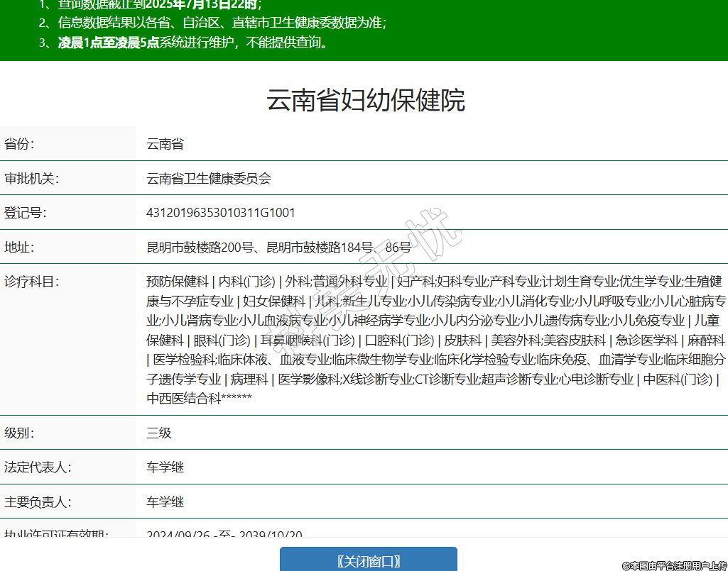 省份:云南省審批機(jī)關(guān):云南省衛(wèi)生健康委員會(huì)登記號(hào):43120196353010311G1001地址:昆明市鼓樓路200號(hào)、昆明市鼓樓路184號(hào)、86號(hào)診療科目:預(yù)防保健科 | 內(nèi)科(門診) | 外科;普通外科專業(yè) | 婦產(chǎn)科;婦科專業(yè);產(chǎn)科專業(yè);計(jì)劃生育專業(yè);優(yōu)生學(xué)專業(yè);生殖健康與不孕癥專業(yè) | 婦女保健科 | 兒科;新生兒專業(yè);小兒傳染病專業(yè);小兒消化專業(yè);小兒呼吸專業(yè);小兒心臟病專業(yè);小兒腎病專業(yè);小兒血液病專業(yè);小兒神經(jīng)病學(xué)專業(yè);小兒內(nèi)分泌專業(yè);小兒遺傳病專業(yè);小兒免疫專業(yè) | 兒童保健科 | 眼科(門診) | 耳鼻咽喉科(門診) | 口腔科(門診) | 皮膚科 | 美容外科;美容皮膚科 | 急診醫(yī)學(xué)科 | 麻醉科 | 醫(yī)學(xué)檢驗(yàn)科;臨床體液、血液專業(yè);臨床微生物學(xué)專業(yè);臨床化學(xué)檢驗(yàn)專業(yè);臨床免疫、血清學(xué)專業(yè);臨床細(xì)胞分子遺傳學(xué)專業(yè) | 病理科 | 醫(yī)學(xué)影像科;X線診斷專業(yè);CT診斷專業(yè);超聲診斷專業(yè);心電診斷專業(yè) | 中醫(yī)科(門診) | 中西醫(yī)結(jié)合科******級(jí)別:三級(jí)法定代表人:車學(xué)繼主要負(fù)責(zé)人:車學(xué)繼執(zhí)業(yè)許可證有效期:2024/09/26 -至- 2039/10/20 -