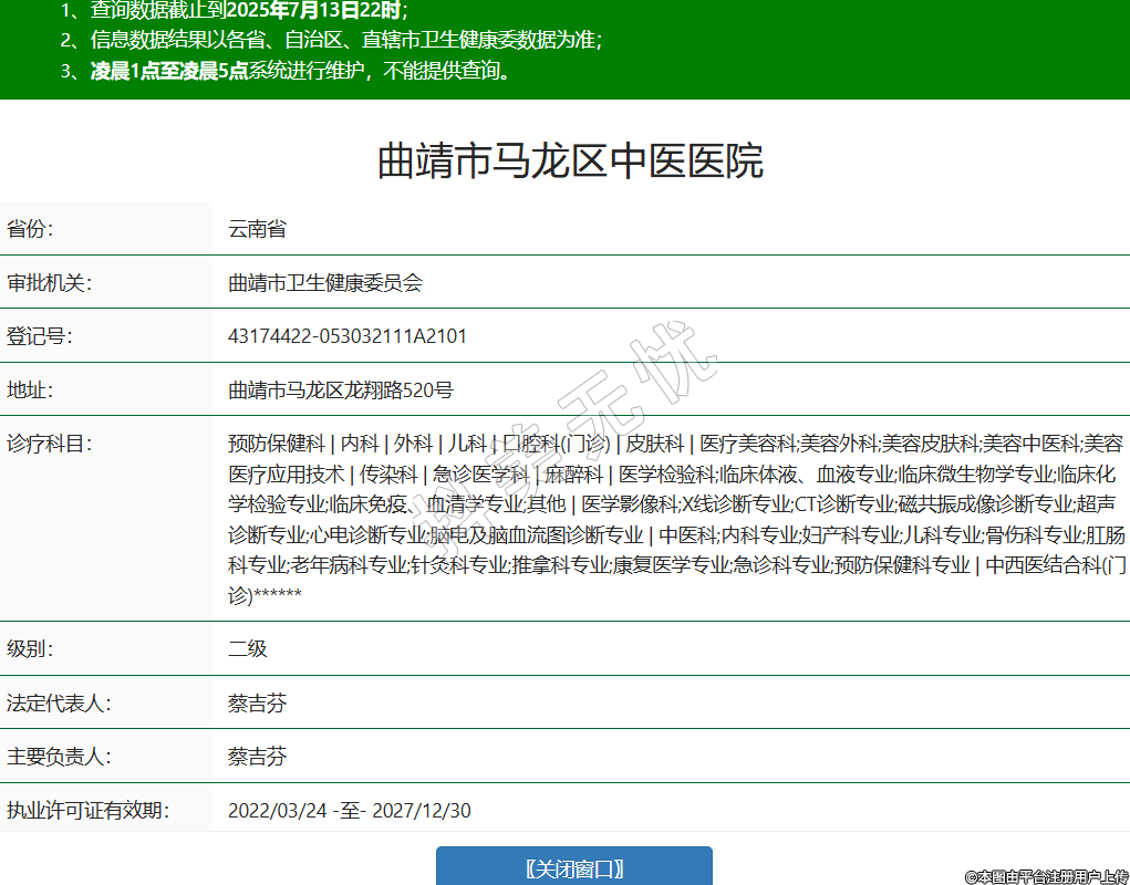 省份:云南省審批機(jī)關(guān):曲靖市衛(wèi)生健康委員會(huì)登記號(hào):43174422-053032111A2101地址:曲靖市馬龍區(qū)龍翔路520號(hào)診療科目:預(yù)防保健科 | 內(nèi)科 | 外科 | 兒科 | 口腔科(門診) | 皮膚科 | 醫(yī)療美容科;美容外科;美容皮膚科;美容中醫(yī)科;美容醫(yī)療應(yīng)用技術(shù) | 傳染科 | 急診醫(yī)學(xué)科 | 麻醉科 | 醫(yī)學(xué)檢驗(yàn)科;臨床體液、血液專業(yè);臨床微生物學(xué)專業(yè);臨床化學(xué)檢驗(yàn)專業(yè);臨床免疫、血清學(xué)專業(yè);其他 | 醫(yī)學(xué)影像科;X線診斷專業(yè);CT診斷專業(yè);磁共振成像診斷專業(yè);超聲診斷專業(yè);心電診斷專業(yè);腦電及腦血流圖診斷專業(yè) | 中醫(yī)科;內(nèi)科專業(yè);婦產(chǎn)科專業(yè);兒科專業(yè);骨傷科專業(yè);肛腸科專業(yè);老年病科專業(yè);針灸科專業(yè);推拿科專業(yè);康復(fù)醫(yī)學(xué)專業(yè);急診科專業(yè);預(yù)防保健科專業(yè) | 中西醫(yī)結(jié)合科(門診)******級(jí)別:二級(jí)法定代表人:蔡吉芬主要負(fù)責(zé)人:蔡吉芬執(zhí)業(yè)許可證有效期:2022/03/24 -至- 2027/12/30 -