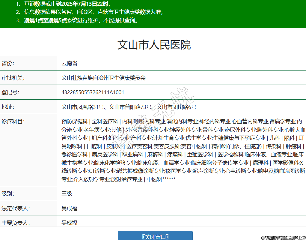 省份:云南省審批機(jī)關(guān):文山壯族苗族自治州衛(wèi)生健康委員會(huì)登記號(hào):43228550553262111A1001地址:文山市鳳凰路31號(hào)、文山市普陽路73號(hào)、文山市團(tuán)山路6號(hào)診療科目:預(yù)防保健科 | 全科醫(yī)療科 | 內(nèi)科;呼吸內(nèi)科專業(yè);消化內(nèi)科專業(yè);神經(jīng)內(nèi)科專業(yè);心血管內(nèi)科專業(yè);腎病學(xué)專業(yè);內(nèi)分泌專業(yè);老年病專業(yè);其他 | 外科;普通外科專業(yè);神經(jīng)外科專業(yè);骨科專業(yè);泌尿外科專業(yè);胸外科專業(yè);心臟大血管外科專業(yè) | 婦產(chǎn)科;婦科專業(yè);產(chǎn)科專業(yè);計(jì)劃生育專業(yè);優(yōu)生學(xué)專業(yè);生殖健康與不孕癥專業(yè) | 兒科 | 眼科 | 耳鼻咽喉科 | 口腔科 | 皮膚科 | 醫(yī)療美容科;美容皮膚科;美容中醫(yī)科 | 精神科(門診、住院部) | 傳染科 | 腫瘤科 | 急診醫(yī)學(xué)科 | 康復(fù)醫(yī)學(xué)科 | 職業(yè)病科 | 麻醉科 | 疼痛科 | 重癥醫(yī)學(xué)科 | 醫(yī)學(xué)檢驗(yàn)科;臨床體液、血液專業(yè);臨床微生物學(xué)專業(yè);臨床化學(xué)檢驗(yàn)專業(yè);臨床免疫、血清學(xué)專業(yè);臨床細(xì)胞分子遺傳學(xué)專業(yè) | 病理科 | 醫(yī)學(xué)影像科;X線診斷專業(yè);CT診斷專業(yè);磁共振成像診斷專業(yè);核醫(yī)學(xué)專業(yè);超聲診斷專業(yè);心電診斷專業(yè);腦電及腦血流圖診斷專業(yè);介入放射學(xué)專業(yè);放射治療專業(yè) | 中醫(yī)科******級(jí)別:三級(jí)法定代表人:吳成福主要負(fù)責(zé)人:吳成福執(zhí)業(yè)許可證有效期:2024/12/23 -至- 2035/11/26 -