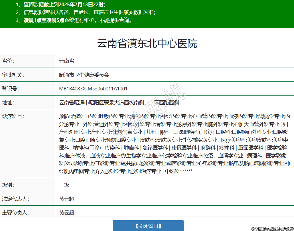 省份:云南省審批機(jī)關(guān):昭通市衛(wèi)生健康委員會登記號:MB1B4083X-M53060011A1001地址:云南省昭通市昭陽區(qū)蒙泉大道西線南側(cè)、二環(huán)西路西側(cè)診療科目:預(yù)防保健科 | 內(nèi)科;呼吸內(nèi)科專業(yè);消化內(nèi)科專業(yè);神經(jīng)內(nèi)科專業(yè);心血管內(nèi)科專業(yè);血液內(nèi)科專業(yè);腎病學(xué)專業(yè);內(nèi)分泌專業(yè) | 外科;普通外科專業(yè);神經(jīng)外科專業(yè);骨科專業(yè);泌尿外科專業(yè);胸外科專業(yè);心臟大血管外科專業(yè) | 婦產(chǎn)科;婦科專業(yè);產(chǎn)科專業(yè);計(jì)劃生育專業(yè) | 兒科 | 眼科 | 耳鼻咽喉科(門診) | 口腔科;口腔頜面外科專業(yè);口腔修復(fù)專業(yè);口腔正畸專業(yè);預(yù)防口腔專業(yè) | 皮膚科;皮膚病專業(yè);性傳播疾病專業(yè) | 醫(yī)療美容科;美容皮膚科;美容中醫(yī)科 | 精神科(門診) | 傳染科 | 腫瘤科 | 急診醫(yī)學(xué)科 | 康復(fù)醫(yī)學(xué)科 | 麻醉科 | 疼痛科 | 重癥醫(yī)學(xué)科 | 醫(yī)學(xué)檢驗(yàn)科;臨床體液、血液專業(yè);臨床微生物學(xué)專業(yè);臨床化學(xué)檢驗(yàn)專業(yè);臨床免疫、血清學(xué)專業(yè) | 病理科 | 醫(yī)學(xué)影像科;X線診斷專業(yè);CT診斷專業(yè);磁共振成像診斷專業(yè);超聲診斷專業(yè);心電診斷專業(yè);腦電及腦血流圖診斷專業(yè);神經(jīng)肌肉電圖專業(yè);介入放射學(xué)專業(yè);放射治療專業(yè) | 中醫(yī)科******級別:三級法定代表人:黃云超主要負(fù)責(zé)人:黃云超執(zhí)業(yè)許可證有效期:2024/11/10 -至- 2039/11/09 -