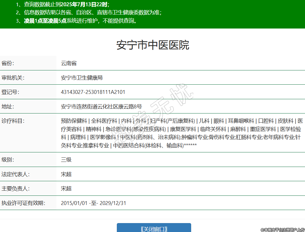 省份:云南省審批機(jī)關(guān):安寧市衛(wèi)生健康局登記號(hào):43143027-253018111A2101地址:安寧市連然街道云化社區(qū)康云路8號(hào)診療科目:預(yù)防保健科 | 全科醫(yī)療科 | 內(nèi)科 | 外科 | 婦產(chǎn)科(產(chǎn)后康復(fù)科) | 兒科 | 眼科 | 耳鼻咽喉科 | 口腔科 | 皮膚科 | 醫(yī)療美容科 | 精神科 | 急診醫(yī)學(xué)科(感染性疾病科) | 康復(fù)醫(yī)學(xué)科 | 臨終關(guān)懷科 | 麻醉科 | 重癥醫(yī)學(xué)科 | 醫(yī)學(xué)檢驗(yàn)科 | 病理科 | 醫(yī)學(xué)影像科 | 中醫(yī)科(藥劑科、治未病科);腫瘤科專業(yè);骨傷科專業(yè);肛腸科專業(yè);老年病科專業(yè);針灸科專業(yè);推拿科專業(yè) | 中西醫(yī)結(jié)合科(體檢科、輸血科)******級(jí)別:三級(jí)法定代表人:宋超主要負(fù)責(zé)人:宋超執(zhí)業(yè)許可證有效期:2015/01/01 -至- 2029/12/31 -