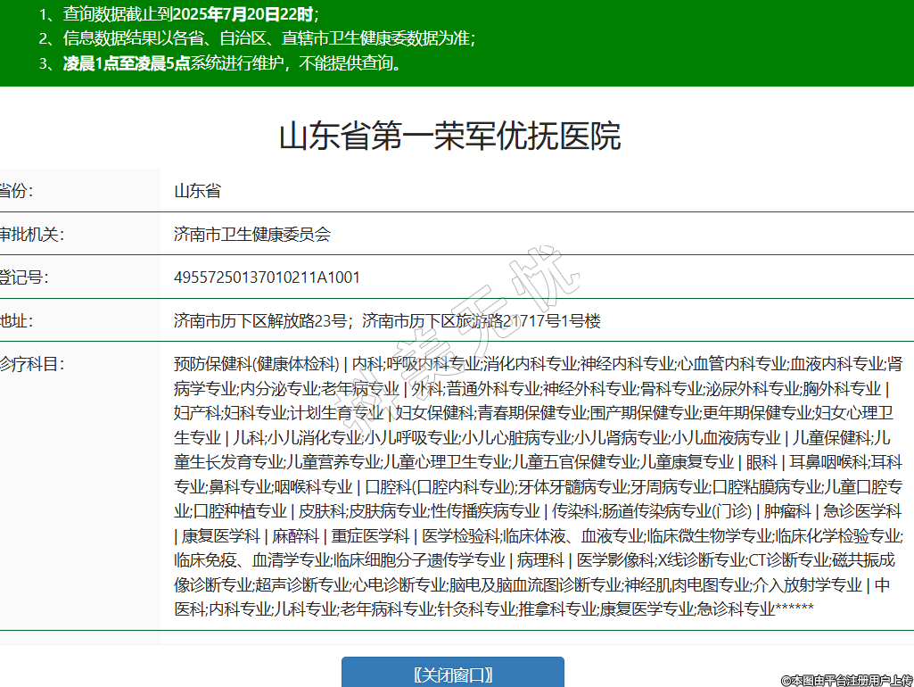 省份:山東省審批機關(guān):濟南市衛(wèi)生健康委員會登記號:49557250137010211A1001地址:濟南市歷下區(qū)解放路23號;濟南市歷下區(qū)旅游路21717號1號樓診療科目:預(yù)防保健科(健康體檢科) | 內(nèi)科;呼吸內(nèi)科專業(yè);消化內(nèi)科專業(yè);神經(jīng)內(nèi)科專業(yè);心血管內(nèi)科專業(yè);血液內(nèi)科專業(yè);腎病學(xué)專業(yè);內(nèi)分泌專業(yè);老年病專業(yè) | 外科;普通外科專業(yè);神經(jīng)外科專業(yè);骨科專業(yè);泌尿外科專業(yè);胸外科專業(yè) | 婦產(chǎn)科;婦科專業(yè);計劃生育專業(yè) | 婦女保健科;青春期保健專業(yè);圍產(chǎn)期保健專業(yè);更年期保健專業(yè);婦女心理衛(wèi)生專業(yè) | 兒科;小兒消化專業(yè);小兒呼吸專業(yè);小兒心臟病專業(yè);小兒腎病專業(yè);小兒血液病專業(yè) | 兒童保健科;兒童生長發(fā)育專業(yè);兒童營養(yǎng)專業(yè);兒童心理衛(wèi)生專業(yè);兒童五官保健專業(yè);兒童康復(fù)專業(yè) | 眼科 | 耳鼻咽喉科;耳科專業(yè);鼻科專業(yè);咽喉科專業(yè) | 口腔科(口腔內(nèi)科專業(yè));牙體牙髓病專業(yè);牙周病專業(yè);口腔粘膜病專業(yè);兒童口腔專業(yè);口腔種植專業(yè) | 皮膚科;皮膚病專業(yè);性傳播疾病專業(yè) | 傳染科;腸道傳染病專業(yè)(門診) | 腫瘤科 | 急診醫(yī)學(xué)科 | 康復(fù)醫(yī)學(xué)科 | 麻醉科 | 重癥醫(yī)學(xué)科 | 醫(yī)學(xué)檢驗科;臨床體液、血液專業(yè);臨床微生物學(xué)專業(yè);臨床化學(xué)檢驗專業(yè);臨床免疫、血清學(xué)專業(yè);臨床細(xì)胞分子遺傳學(xué)專業(yè) | 病理科 | 醫(yī)學(xué)影像科;X線診斷專業(yè);CT診斷專業(yè);磁共振成像診斷專業(yè);超聲診斷專業(yè);心電診斷專業(yè);腦電及腦血流圖診斷專業(yè);神經(jīng)肌肉電圖專業(yè);介入放射學(xué)專業(yè) | 中醫(yī)科;內(nèi)科專業(yè);兒科專業(yè);老年病科專業(yè);針灸科專業(yè);推拿科專業(yè);康復(fù)醫(yī)學(xué)專業(yè);急診科專業(yè)******級別:二級法定代表人:孫士營主要負(fù)責(zé)人:孫士營執(zhí)業(yè)許可證有效期:2025/03/11 -至- 2033/10/23 -
