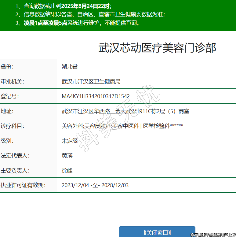 省份:湖北省審批機關:武漢市江漢區(qū)衛(wèi)生健康局登記號:MA4KY1H3342010317D1542地址:武漢市江漢區(qū)華西路三金大武漢1911C棟2層(5)商室診療科目:美容外科;美容皮膚科;美容中醫(yī)科 | 醫(yī)學檢驗科******級別:未定級法定代表人:黃瑛主要負責人:徐峰執(zhí)業(yè)許可證有效期:2023/12/04 -至- 2028/12/03 -