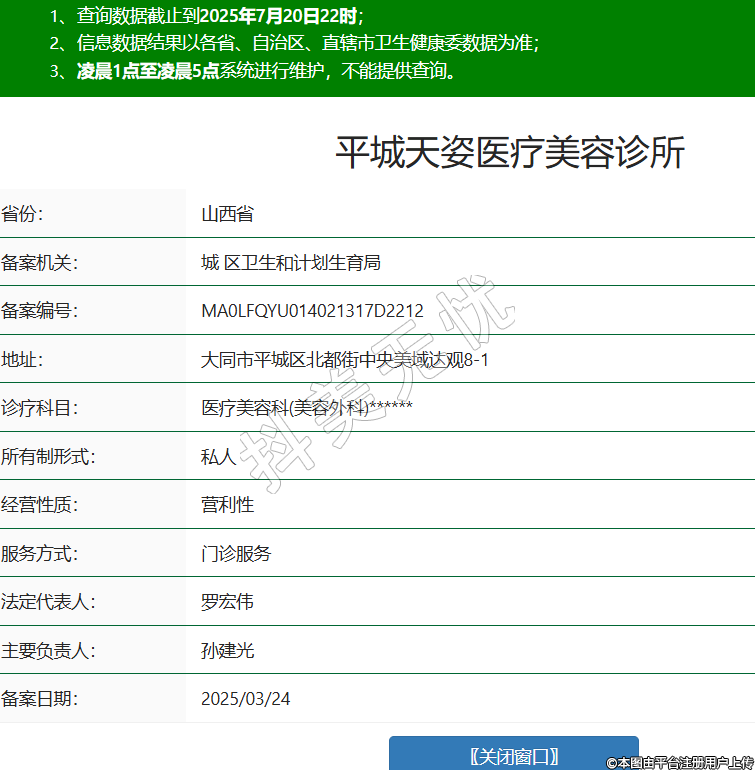 省份:山西省備案機(jī)關(guān):城 區(qū)衛(wèi)生和計(jì)劃生育局備案編號(hào):MA0LFQYU014021317D2212地址:大同市平城區(qū)北都街中央美域達(dá)觀8-1診療科目:醫(yī)療美容科(美容外科)******所有制形式:私人經(jīng)營性質(zhì):營利性服務(wù)方式:門診服務(wù)法定代表人:羅宏偉主要負(fù)責(zé)人:孫建光備案日期:2025/03/24 -