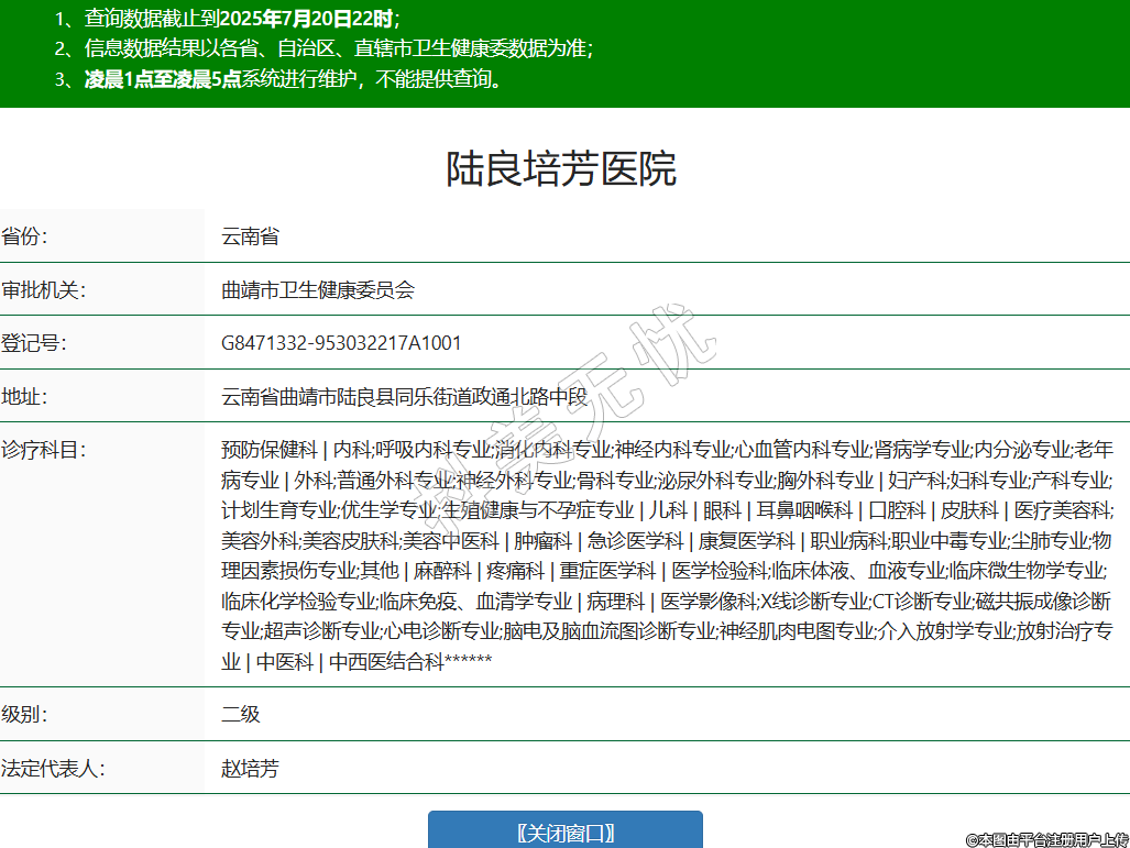 省份:云南省審批機(jī)關(guān):曲靖市衛(wèi)生健康委員會登記號:G8471332-953032217A1001地址:云南省曲靖市陸良縣同樂街道政通北路中段診療科目:預(yù)防保健科 | 內(nèi)科;呼吸內(nèi)科專業(yè);消化內(nèi)科專業(yè);神經(jīng)內(nèi)科專業(yè);心血管內(nèi)科專業(yè);腎病學(xué)專業(yè);內(nèi)分泌專業(yè);老年病專業(yè) | 外科;普通外科專業(yè);神經(jīng)外科專業(yè);骨科專業(yè);泌尿外科專業(yè);胸外科專業(yè) | 婦產(chǎn)科;婦科專業(yè);產(chǎn)科專業(yè);計(jì)劃生育專業(yè);優(yōu)生學(xué)專業(yè);生殖健康與不孕癥專業(yè) | 兒科 | 眼科 | 耳鼻咽喉科 | 口腔科 | 皮膚科 | 醫(yī)療美容科;美容外科;美容皮膚科;美容中醫(yī)科 | 腫瘤科 | 急診醫(yī)學(xué)科 | 康復(fù)醫(yī)學(xué)科 | 職業(yè)病科;職業(yè)中毒專業(yè);塵肺專業(yè);物理因素?fù)p傷專業(yè);其他 | 麻醉科 | 疼痛科 | 重癥醫(yī)學(xué)科 | 醫(yī)學(xué)檢驗(yàn)科;臨床體液、血液專業(yè);臨床微生物學(xué)專業(yè);臨床化學(xué)檢驗(yàn)專業(yè);臨床免疫、血清學(xué)專業(yè) | 病理科 | 醫(yī)學(xué)影像科;X線診斷專業(yè);CT診斷專業(yè);磁共振成像診斷專業(yè);超聲診斷專業(yè);心電診斷專業(yè);腦電及腦血流圖診斷專業(yè);神經(jīng)肌肉電圖專業(yè);介入放射學(xué)專業(yè);放射治療專業(yè) | 中醫(yī)科 | 中西醫(yī)結(jié)合科******級別:二級法定代表人:趙培芳主要負(fù)責(zé)人:趙培芳執(zhí)業(yè)許可證有效期:2022/12/31 -至- 2037/12/30 -