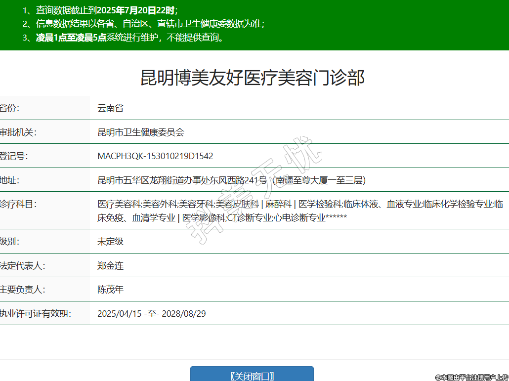 省份:云南省審批機(jī)關(guān):昆明市衛(wèi)生健康委員會(huì)登記號:MACPH3QK-153010219D1542地址:昆明市五華區(qū)龍翔街道辦事處東風(fēng)西路241號(南疆至尊大廈一至三層)診療科目:醫(yī)療美容科;美容外科;美容牙科;美容皮膚科 | 麻醉科 | 醫(yī)學(xué)檢驗(yàn)科;臨床體液、血液專業(yè);臨床化學(xué)檢驗(yàn)專業(yè);臨床免疫、血清學(xué)專業(yè) | 醫(yī)學(xué)影像科;CT診斷專業(yè);心電診斷專業(yè)******級別:未定級法定代表人:鄭金連主要負(fù)責(zé)人:陳茂年執(zhí)業(yè)許可證有效期:2025/04/15 -至- 2028/08/29 -