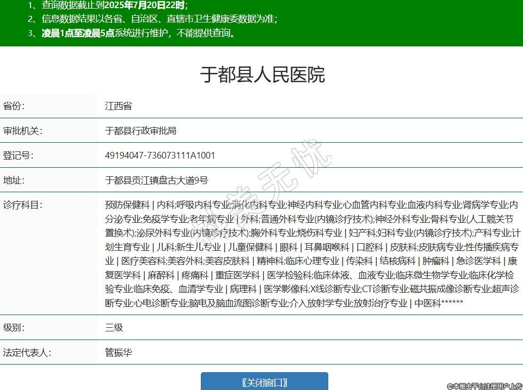 省份:江西省審批機(jī)關(guān):于都縣行政審批局登記號(hào):49194047-736073111A1001地址:于都縣貢江鎮(zhèn)盤古大道9號(hào)診療科目:預(yù)防保健科 | 內(nèi)科;呼吸內(nèi)科專業(yè);消化內(nèi)科專業(yè);神經(jīng)內(nèi)科專業(yè);心血管內(nèi)科專業(yè);血液內(nèi)科專業(yè);腎病學(xué)專業(yè);內(nèi)分泌專業(yè);免疫學(xué)專業(yè);老年病專業(yè) | 外科;普通外科專業(yè)(內(nèi)鏡診療技術(shù));神經(jīng)外科專業(yè);骨科專業(yè)(人工髖關(guān)節(jié)置換術(shù));泌尿外科專業(yè)(內(nèi)鏡診療技術(shù));胸外科專業(yè);燒傷科專業(yè) | 婦產(chǎn)科;婦科專業(yè)(內(nèi)鏡診療技術(shù));產(chǎn)科專業(yè);計(jì)劃生育專業(yè) | 兒科;新生兒專業(yè) | 兒童保健科 | 眼科 | 耳鼻咽喉科 | 口腔科 | 皮膚科;皮膚病專業(yè);性傳播疾病專業(yè) | 醫(yī)療美容科;美容外科;美容皮膚科 | 精神科;臨床心理專業(yè) | 傳染科 | 結(jié)核病科 | 腫瘤科 | 急診醫(yī)學(xué)科 | 康復(fù)醫(yī)學(xué)科 | 麻醉科 | 疼痛科 | 重癥醫(yī)學(xué)科 | 醫(yī)學(xué)檢驗(yàn)科;臨床體液、血液專業(yè);臨床微生物學(xué)專業(yè);臨床化學(xué)檢驗(yàn)專業(yè);臨床免疫、血清學(xué)專業(yè) | 病理科 | 醫(yī)學(xué)影像科;X線診斷專業(yè);CT診斷專業(yè);磁共振成像診斷專業(yè);超聲診斷專業(yè);心電診斷專業(yè);腦電及腦血流圖診斷專業(yè);介入放射學(xué)專業(yè);放射治療專業(yè) | 中醫(yī)科******級(jí)別:三級(jí)法定代表人:管振華主要負(fù)責(zé)人:管振華執(zhí)業(yè)許可證有效期:2024/10/21 -至- 2037/05/13 -