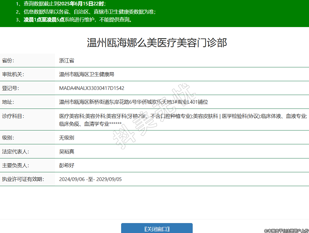 省份:浙江省審批機(jī)關(guān):溫州市甌海區(qū)衛(wèi)生健康局登記號(hào):MADA4NALX33030417D1542地址:溫州市甌海區(qū)新橋街道東岸花路6號(hào)華僑城歡樂(lè)天地3#商業(yè)L401鋪位診療科目:醫(yī)療美容科;美容外科;美容牙科(牙椅2張、不含口腔種植專業(yè));美容皮膚科 | 醫(yī)學(xué)檢驗(yàn)科(協(xié)議);臨床體液、血液專業(yè);臨床免疫、血清學(xué)專業(yè)******級(jí)別:無(wú)級(jí)別法定代表人:吳裕真主要負(fù)責(zé)人:彭希好執(zhí)業(yè)許可證有效期:2024/09/06 -至- 2029/09/05 -