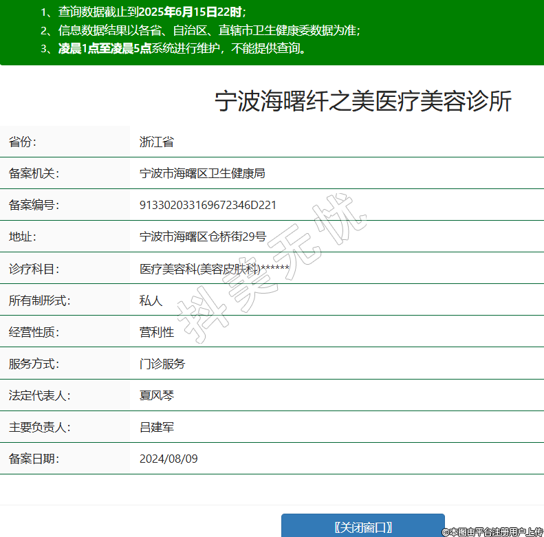 省份:浙江省備案機(jī)關(guān):寧波市海曙區(qū)衛(wèi)生健康局備案編號(hào):913302033169672346D221地址:寧波市海曙區(qū)倉橋街29號(hào)診療科目:醫(yī)療美容科(美容皮膚科)******所有制形式:私人經(jīng)營(yíng)性質(zhì):營(yíng)利性服務(wù)方式:門診服務(wù)法定代表人:夏風(fēng)琴主要負(fù)責(zé)人:呂建軍備案日期:2024/08/09 -
