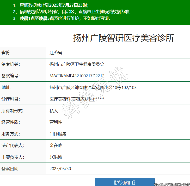 省份:江蘇省備案機關(guān):揚州市廣陵區(qū)衛(wèi)生健康委員會備案編號:MACRKAME432100217D2212地址:揚州市廣陵區(qū)錦泰路錦堂花園小區(qū)10棟102/103診療科目:醫(yī)療美容科(美容皮膚科)******所有制形式:私人經(jīng)營性質(zhì):營利性服務(wù)方式:門診服務(wù)法定代表人:金在峰主要負責(zé)人:趙洪波備案日期:2025/05/30 -