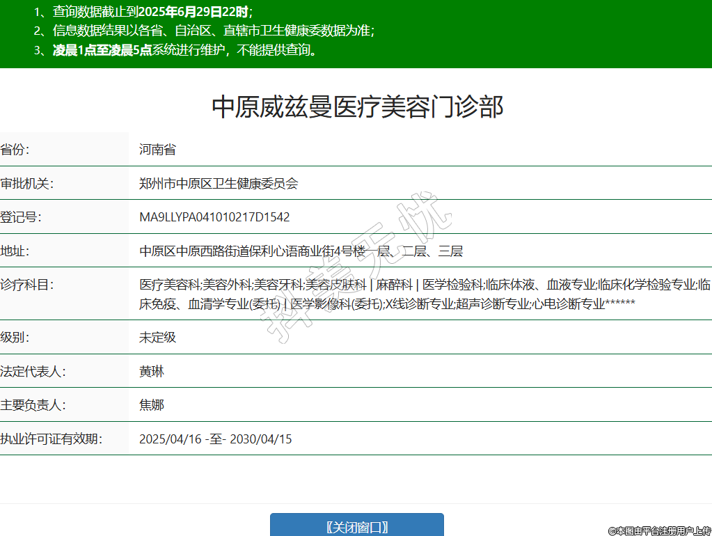 鄭州威茲曼醫(yī)療美容,診療科目:醫(yī)療美容科;美容外科;美容牙科;美容皮膚科 | 麻醉科 | 醫(yī)學(xué)檢驗(yàn)科;臨床體液、血液專(zhuān)業(yè);臨床化學(xué)檢驗(yàn)專(zhuān)業(yè);臨床免疫、血清學(xué)專(zhuān)業(yè)(委托) | 醫(yī)學(xué)影像科(委托);X線診斷專(zhuān)業(yè);超聲診斷專(zhuān)業(yè);心電診斷專(zhuān)業(yè)******