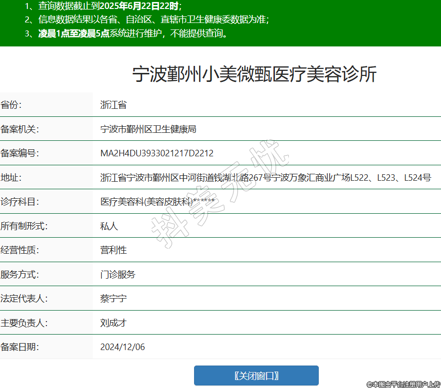 省份:浙江省備案機(jī)關(guān):寧波市鄞州區(qū)衛(wèi)生健康局備案編號:MA2H4DU3933021217D2212地址:浙江省寧波市鄞州區(qū)中河街道錢湖北路267號寧波萬象匯商業(yè)廣場L522、L523、L524號診療科目:醫(yī)療美容科(美容皮膚科)******所有制形式:私人經(jīng)營性質(zhì):營利性服務(wù)方式:門診服務(wù)法定代表人:蔡寧寧主要負(fù)責(zé)人:劉成才備案日期:2024/12/06 -
