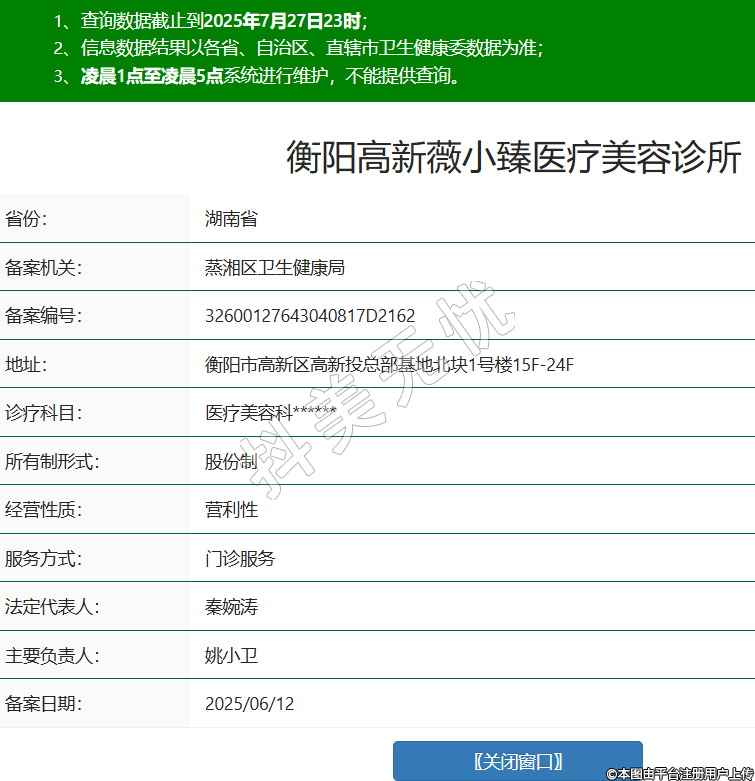 省份:湖南省備案機(jī)關(guān):蒸湘區(qū)衛(wèi)生健康局備案編號(hào):32600127643040817D2162地址:衡陽(yáng)市高新區(qū)高新投總部基地北塊1號(hào)樓15F-24F診療科目:醫(yī)療美容科******所有制形式:股份制經(jīng)營(yíng)性質(zhì):營(yíng)利性服務(wù)方式:門(mén)診服務(wù)法定代表人:秦婉濤主要負(fù)責(zé)人:姚小衛(wèi)備案日期:2025/06/12 -
