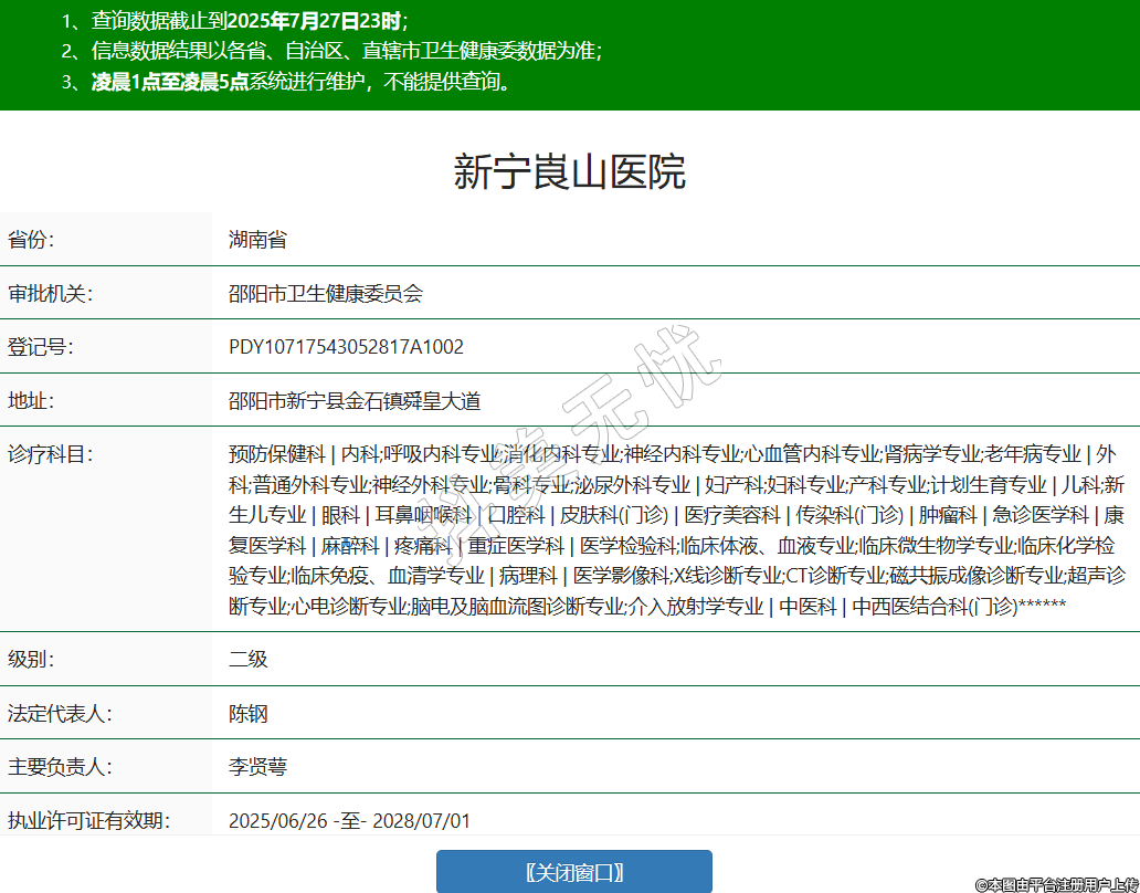 省份:湖南省審批機(jī)關(guān):邵陽市衛(wèi)生健康委員會(huì)登記號(hào):PDY10717543052817A1002地址:邵陽市新寧縣金石鎮(zhèn)舜皇大道診療科目:預(yù)防保健科 | 內(nèi)科;呼吸內(nèi)科專業(yè);消化內(nèi)科專業(yè);神經(jīng)內(nèi)科專業(yè);心血管內(nèi)科專業(yè);腎病學(xué)專業(yè);老年病專業(yè) | 外科;普通外科專業(yè);神經(jīng)外科專業(yè);骨科專業(yè);泌尿外科專業(yè) | 婦產(chǎn)科;婦科專業(yè);產(chǎn)科專業(yè);計(jì)劃生育專業(yè) | 兒科;新生兒專業(yè) | 眼科 | 耳鼻咽喉科 | 口腔科 | 皮膚科(門診) | 醫(yī)療美容科 | 傳染科(門診) | 腫瘤科 | 急診醫(yī)學(xué)科 | 康復(fù)醫(yī)學(xué)科 | 麻醉科 | 疼痛科 | 重癥醫(yī)學(xué)科 | 醫(yī)學(xué)檢驗(yàn)科;臨床體液、血液專業(yè);臨床微生物學(xué)專業(yè);臨床化學(xué)檢驗(yàn)專業(yè);臨床免疫、血清學(xué)專業(yè) | 病理科 | 醫(yī)學(xué)影像科;X線診斷專業(yè);CT診斷專業(yè);磁共振成像診斷專業(yè);超聲診斷專業(yè);心電診斷專業(yè);腦電及腦血流圖診斷專業(yè);介入放射學(xué)專業(yè) | 中醫(yī)科 | 中西醫(yī)結(jié)合科(門診)******級(jí)別:二級(jí)法定代表人:陳鋼主要負(fù)責(zé)人:李賢萼 -