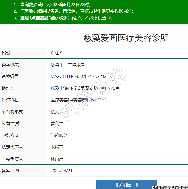 省份:浙江省備案機(jī)關(guān):慈溪市衛(wèi)生健康局備案編號(hào):MA2GTTLH-533028217D2212地址:慈溪市滸山街道團(tuán)圈支路1幢18-20室診療科目:醫(yī)療美容科(美容皮膚科)******所有制形式:私人經(jīng)營(yíng)性質(zhì):營(yíng)利性服務(wù)方式:門診服務(wù)法定代表人:張淑萍主要負(fù)責(zé)人:林京晶備案日期:2023/04/21 -