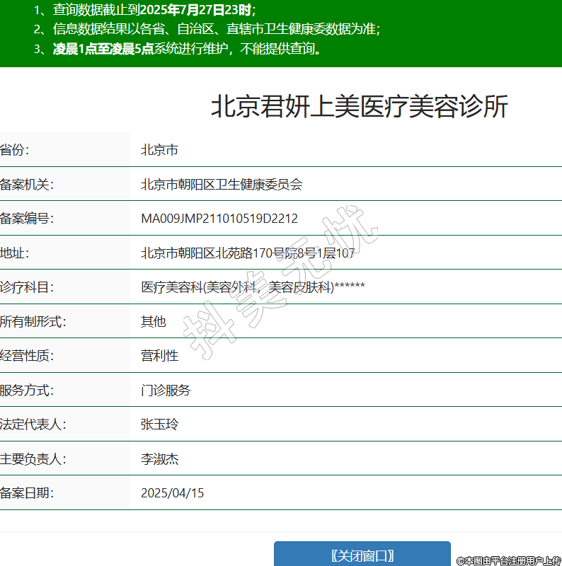 省份:北京市備案機(jī)關(guān):北京市朝陽區(qū)衛(wèi)生健康委員會備案編號:MA009JMP211010519D2212地址:北京市朝陽區(qū)北苑路170號院8號1層107診療科目:醫(yī)療美容科(美容外科,美容皮膚科)******所有制形式:其他經(jīng)營性質(zhì):營利性服務(wù)方式:門診服務(wù)法定代表人:張玉玲主要負(fù)責(zé)人:李淑杰備案日期:2025/04/15 -