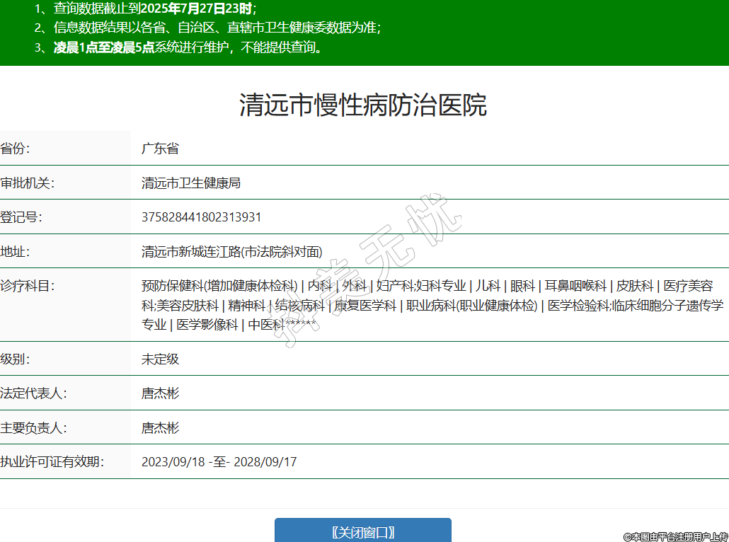 省份:廣東省審批機(jī)關(guān):清遠(yuǎn)市衛(wèi)生健康局登記號(hào):375828441802313931地址:清遠(yuǎn)市新城連江路(市法院斜對(duì)面)診療科目:預(yù)防保健科(增加健康體檢科) | 內(nèi)科 | 外科 | 婦產(chǎn)科;婦科專業(yè) | 兒科 | 眼科 | 耳鼻咽喉科 | 皮膚科 | 醫(yī)療美容科;美容皮膚科 | 精神科 | 結(jié)核病科 | 康復(fù)醫(yī)學(xué)科 | 職業(yè)病科(職業(yè)健康體檢) | 醫(yī)學(xué)檢驗(yàn)科;臨床細(xì)胞分子遺傳學(xué)專業(yè) | 醫(yī)學(xué)影像科 | 中醫(yī)科******級(jí)別:未定級(jí)法定代表人:唐杰彬主要負(fù)責(zé)人:唐杰彬執(zhí)業(yè)許可證有效期:2023/09/18 -至- 2028/09/17 -