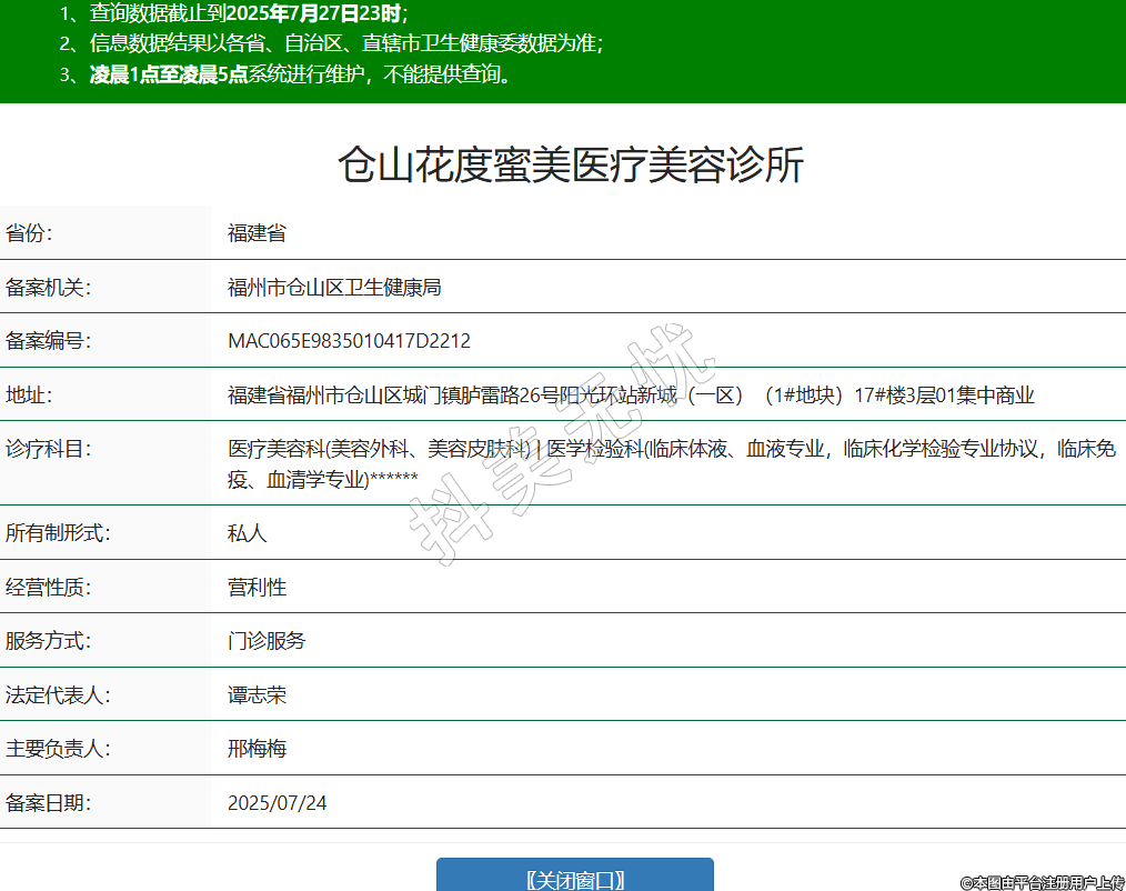 省份:福建省備案機(jī)關(guān):福州市倉山區(qū)衛(wèi)生健康局備案編號(hào):MAC065E9835010417D2212地址:福建省福州市倉山區(qū)城門鎮(zhèn)臚雷路26號(hào)陽光環(huán)站新城(一區(qū))(1#地塊)17#樓3層01集中商業(yè)診療科目:醫(yī)療美容科(美容外科、美容皮膚科) | 醫(yī)學(xué)檢驗(yàn)科(臨床體液、血液專業(yè),臨床化學(xué)檢驗(yàn)專業(yè)協(xié)議,臨床免疫、血清學(xué)專業(yè))******所有制形式:私人經(jīng)營性質(zhì):營利性服務(wù)方式:門診服務(wù)法定代表人:譚志榮主要負(fù)責(zé)人:邢梅梅備案日期:2025/07/24 -