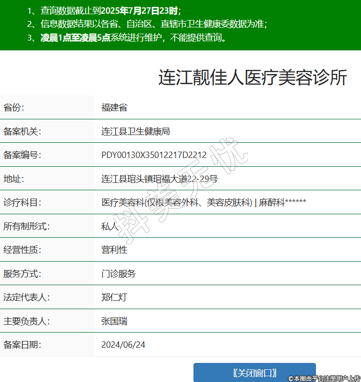 省份:福建省備案機(jī)關(guān):連江縣衛(wèi)生健康局備案編號(hào):PDY00130X35012217D2212地址:連江縣琯頭鎮(zhèn)琯福大道22-29號(hào)診療科目:醫(yī)療美容科(僅限美容外科、美容皮膚科) | 麻醉科******所有制形式:私人經(jīng)營(yíng)性質(zhì):營(yíng)利性服務(wù)方式:門(mén)診服務(wù)法定代表人:鄭仁燈主要負(fù)責(zé)人:張國(guó)瑞備案日期:2024/06/24 -