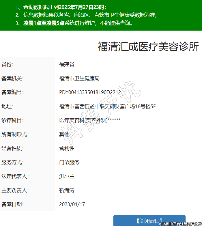 省份:福建省備案機(jī)關(guān):福清市衛(wèi)生健康局備案編號:PDY00413335018190D2212地址:福清市音西街道中聯(lián)天御財富廣場16號樓5F診療科目:醫(yī)療美容科(美容外科)******所有制形式:其他經(jīng)營性質(zhì):營利性服務(wù)方式:門診服務(wù)法定代表人:洪小蘭主要負(fù)責(zé)人:靳海濤備案日期:2023/01/17 -