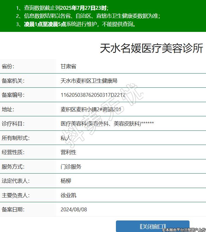 省份:甘肅省備案機關(guān):天水市麥積區(qū)衛(wèi)生健康局備案編號:116205038762050317D2212地址:麥積區(qū)麥積小鎮(zhèn)2#商鋪201診療科目:醫(yī)療美容科(美容外科、美容皮膚科)******所有制形式:私人經(jīng)營性質(zhì):營利性服務(wù)方式:門診服務(wù)法定代表人:楊柳主要負責(zé)人:徐業(yè)凱備案日期:2024/08/08 -