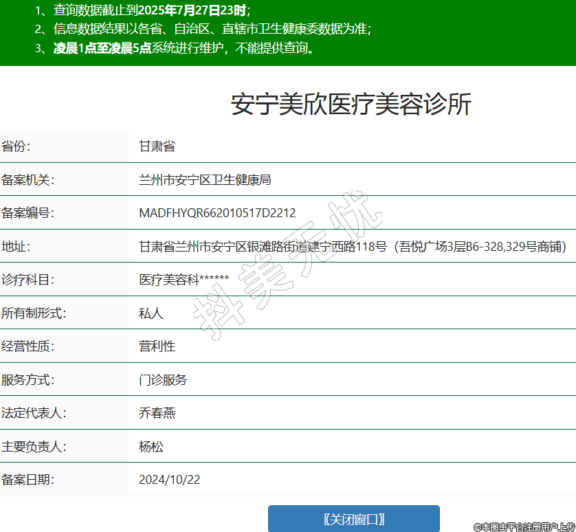 省份:甘肅省備案機(jī)關(guān):蘭州市安寧區(qū)衛(wèi)生健康局備案編號(hào):MADFHYQR662010517D2212地址:甘肅省蘭州市安寧區(qū)銀灘路街道建寧西路118號(hào)(吾悅廣場(chǎng)3層B6-328,329號(hào)商鋪)診療科目:醫(yī)療美容科******所有制形式:私人經(jīng)營(yíng)性質(zhì):營(yíng)利性服務(wù)方式:門診服務(wù)法定代表人:喬春燕主要負(fù)責(zé)人:楊松備案日期:2024/10/22 -