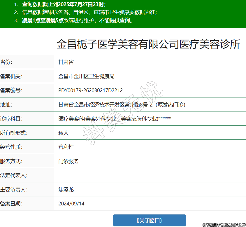 省份:甘肅省備案機(jī)關(guān):金昌市金川區(qū)衛(wèi)生健康局備案編號(hào):PDY00179-262030217D2212地址:甘肅省金昌市經(jīng)濟(jì)技術(shù)開發(fā)區(qū)常州路8號(hào)-2(原發(fā)熱門診)診療科目:醫(yī)療美容科(美容外科專業(yè)、美容皮膚科專業(yè))******所有制形式:私人經(jīng)營(yíng)性質(zhì):營(yíng)利性服務(wù)方式:門診服務(wù)法定代表人:主要負(fù)責(zé)人:焦?jié)升?/div>備案日期:2024/09/14暫時(shí)沒有內(nèi)容