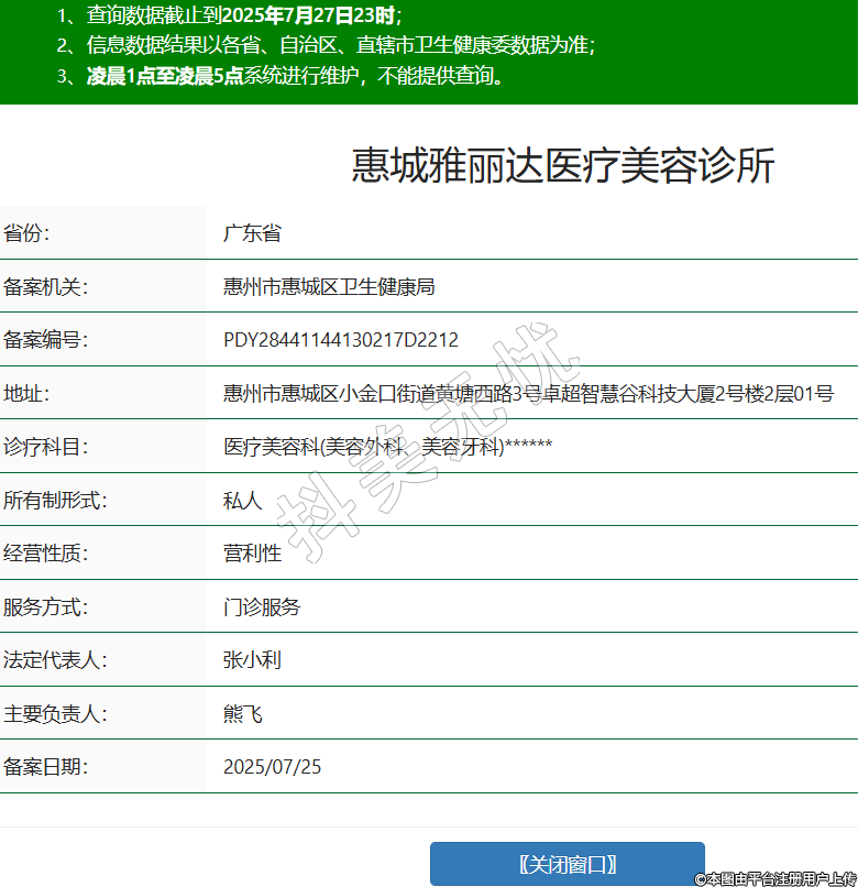 省份:廣東省備案機關:惠州市惠城區(qū)衛(wèi)生健康局備案編號:PDY28441144130217D2212地址:惠州市惠城區(qū)小金口街道黃塘西路3號卓超智慧谷科技大廈2號樓2層01號診療科目:醫(yī)療美容科(美容外科、美容牙科)******所有制形式:私人經營性質:營利性服務方式:門診服務法定代表人:張小利主要負責人:熊飛備案日期:2025/07/25 -