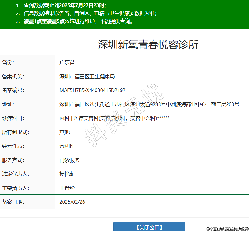 省份:廣東省備案機關:深圳市福田區(qū)衛(wèi)生健康局備案編號:MAE5H7B5-X44030415D2192地址:深圳市福田區(qū)沙頭街道上沙社區(qū)濱河大道9283號中洲濱海商業(yè)中心一期二層203號診療科目:內科 | 醫(yī)療美容科(美容皮膚科,美容中醫(yī)科)******所有制形式:其他經營性質:營利性服務方式:門診服務法定代表人:楊艷茹主要負責人:王希綸備案日期:2025/02/26 -