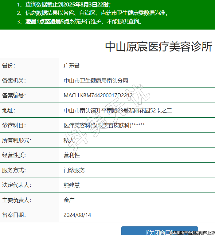 省份:廣東省備案機(jī)關(guān):中山市衛(wèi)生健康局南頭分局備案編號:MACLLKBM744200017D2212地址:中山市南頭鎮(zhèn)升平南路23號翡麗花園52卡之二診療科目:醫(yī)療美容科(僅限美容皮膚科)******所有制形式:私人經(jīng)營性質(zhì):營利性服務(wù)方式:門診服務(wù)法定代表人:熊建慧主要負(fù)責(zé)人:金廣備案日期:2024/08/14 -