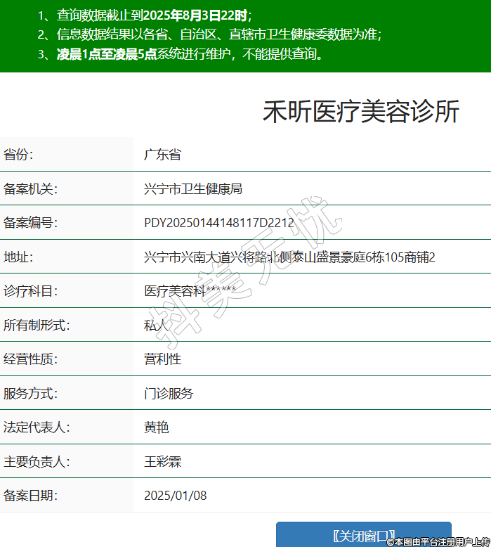 省份:廣東省備案機(jī)關(guān):興寧市衛(wèi)生健康局備案編號(hào):PDY20250144148117D2212地址:興寧市興南大道興將路北側(cè)泰山盛景豪庭6棟105商鋪2診療科目:醫(yī)療美容科******所有制形式:私人經(jīng)營(yíng)性質(zhì):營(yíng)利性服務(wù)方式:門(mén)診服務(wù)法定代表人:黃艷主要負(fù)責(zé)人:王彩霖備案日期:2025/01/08 -