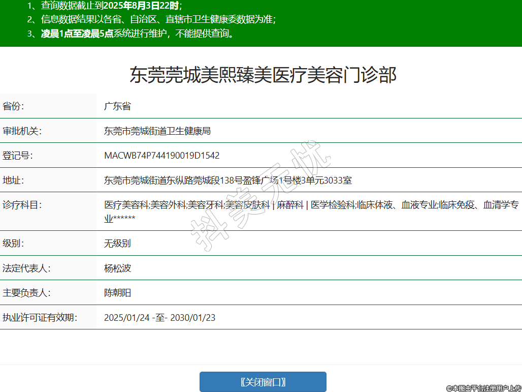 省份:廣東省審批機(jī)關(guān):東莞市莞城街道衛(wèi)生健康局登記號:MACWB74P744190019D1542地址:東莞市莞城街道東縱路莞城段138號盈鋒廣場1號樓3單元3033室診療科目:醫(yī)療美容科;美容外科;美容牙科;美容皮膚科 | 麻醉科 | 醫(yī)學(xué)檢驗(yàn)科;臨床體液、血液專業(yè);臨床免疫、血清學(xué)專業(yè)******級別:無級別法定代表人:楊松波主要負(fù)責(zé)人:陳朝陽執(zhí)業(yè)許可證有效期:2025/01/24 -至- 2030/01/23 -