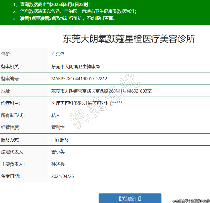 省份:廣東省備案機(jī)關(guān):東莞市大朗鎮(zhèn)衛(wèi)生健康局備案編號:MABP52XC044190017D2212地址:東莞市大朗鎮(zhèn)求富路長富西路268號1號樓602-603室診療科目:醫(yī)療美容科(僅限開展美容外科)******所有制形式:私人經(jīng)營性質(zhì):營利性服務(wù)方式:門診服務(wù)法定代表人:曾小英主要負(fù)責(zé)人:孫曉兵備案日期:2024/04/26 -