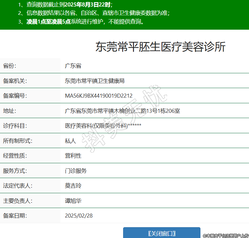 省份:廣東省備案機(jī)關(guān):東莞市常平鎮(zhèn)衛(wèi)生健康局備案編號(hào):MA56KJ9BX44190019D2212地址:廣東省東莞市常平鎮(zhèn)木棆創(chuàng)業(yè)二路13號(hào)1棟206室診療科目:醫(yī)療美容科(僅限美容外科)******所有制形式:私人經(jīng)營(yíng)性質(zhì):營(yíng)利性服務(wù)方式:門診服務(wù)法定代表人:莫吉玲主要負(fù)責(zé)人:譚旭華備案日期:2025/02/28 -
