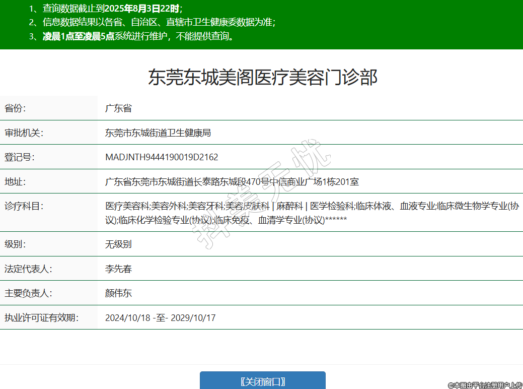 省份:廣東省審批機(jī)關(guān):東莞市東城街道衛(wèi)生健康局登記號:MADJNTH9444190019D2162地址:廣東省東莞市東城街道長泰路東城段470號中信商業(yè)廣場1棟201室診療科目:醫(yī)療美容科;美容外科;美容牙科;美容皮膚科 | 麻醉科 | 醫(yī)學(xué)檢驗科;臨床體液、血液專業(yè);臨床微生物學(xué)專業(yè)(協(xié)議);臨床化學(xué)檢驗專業(yè)(協(xié)議);臨床免疫、血清學(xué)專業(yè)(協(xié)議)******級別:無級別法定代表人:李先春主要負(fù)責(zé)人:顏偉東執(zhí)業(yè)許可證有效期:2024/10/18 -至- 2029/10/17 -