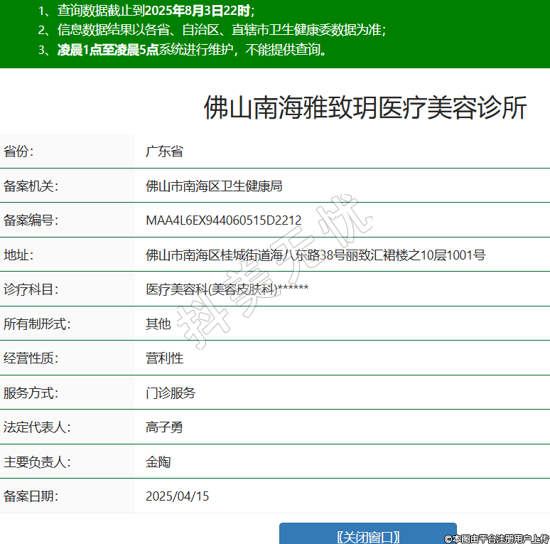 省份:廣東省備案機關:佛山市南海區(qū)衛(wèi)生健康局備案編號:MAA4L6EX944060515D2212地址:佛山市南海區(qū)桂城街道海八東路38號麗致匯裙樓之10層1001號診療科目:醫(yī)療美容科(美容皮膚科)******所有制形式:其他經(jīng)營性質(zhì):營利性服務方式:門診服務法定代表人:高子勇主要負責人:金陶備案日期:2025/04/15 -