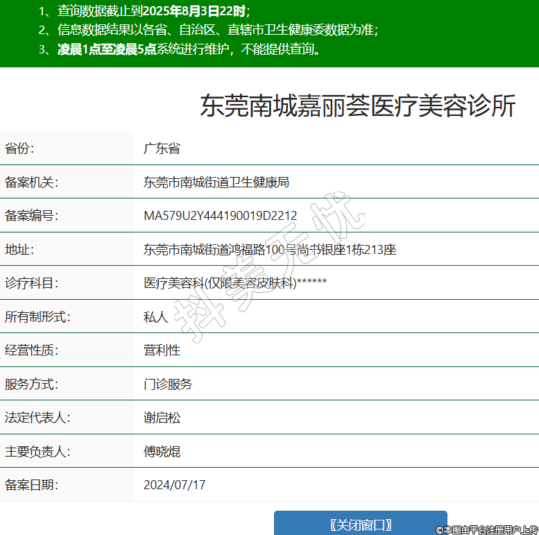 省份:廣東省備案機關:東莞市南城街道衛(wèi)生健康局備案編號:MA579U2Y444190019D2212地址:東莞市南城街道鴻福路100號尚書銀座1棟213座診療科目:醫(yī)療美容科(僅限美容皮膚科)******所有制形式:私人經營性質:營利性服務方式:門診服務法定代表人:謝啟松主要負責人:傅曉焜備案日期:2024/07/17 -