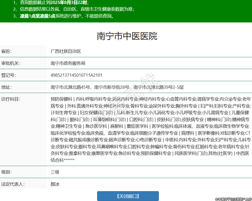 省份:廣西壯族自治區(qū)審批機(jī)關(guān):南寧市政務(wù)服務(wù)局登記號(hào):49852137145010711A2101地址:南寧市北湖北路45號(hào)、南寧市新華街28號(hào)、南寧市北湖北路39號(hào)2-5層診療科目:預(yù)防保健科 | 內(nèi)科;呼吸內(nèi)科專業(yè);消化內(nèi)科專業(yè);神經(jīng)內(nèi)科專業(yè);心血管內(nèi)科專業(yè);腎病學(xué)專業(yè);內(nèi)分泌專業(yè);老年病專業(yè) | 外科;普通外科專業(yè);神經(jīng)外科專業(yè);骨科專業(yè);泌尿外科專業(yè);胸外科專業(yè) | 婦產(chǎn)科;婦科專業(yè);產(chǎn)科專業(yè);計(jì)劃生育專業(yè) | 婦女保健科(門診) | 兒科;新生兒專業(yè);小兒消化專業(yè);小兒呼吸專業(yè);小兒腎病專業(yè) | 兒童保健科(門診) | 眼科(門診) | 耳鼻咽喉科(門診) | 口腔科(門診) | 皮膚科(門診);皮膚病專業(yè) | 精神科(門診);精神病專業(yè);精神衛(wèi)生專業(yè) | 急診醫(yī)學(xué)科 | 麻醉科 | 重癥醫(yī)學(xué)科 | 醫(yī)學(xué)檢驗(yàn)科;臨床體液、血液專業(yè);臨床微生物學(xué)專業(yè);臨床化學(xué)檢驗(yàn)專業(yè);臨床免疫、血清學(xué)專業(yè);臨床細(xì)胞分子遺傳學(xué)專業(yè) | 病理科 | 醫(yī)學(xué)影像科;X線診斷專業(yè);CT診斷專業(yè);磁共振成像診斷專業(yè);超聲診斷專業(yè);心電診斷專業(yè) | 中醫(yī)科;內(nèi)科專業(yè);外科專業(yè);婦產(chǎn)科專業(yè);兒科專業(yè);皮膚科專業(yè);眼科專業(yè);耳鼻咽喉科專業(yè);口腔科專業(yè);腫瘤科專業(yè);骨傷科專業(yè);肛腸科專業(yè);老年病科專業(yè);針灸科專業(yè);推拿科專業(yè);康復(fù)醫(yī)學(xué)專業(yè);急診科專業(yè);預(yù)防保健科專業(yè) | 民族醫(yī)學(xué)科(門診);其他(壯醫(yī)學(xué)) | 中西醫(yī)結(jié)合科******級(jí)別:三級(jí)法定代表人:顏冰主要負(fù)責(zé)人:顏冰執(zhí)業(yè)許可證有效期:2025/07/16 -至- 2032/01/27 -
