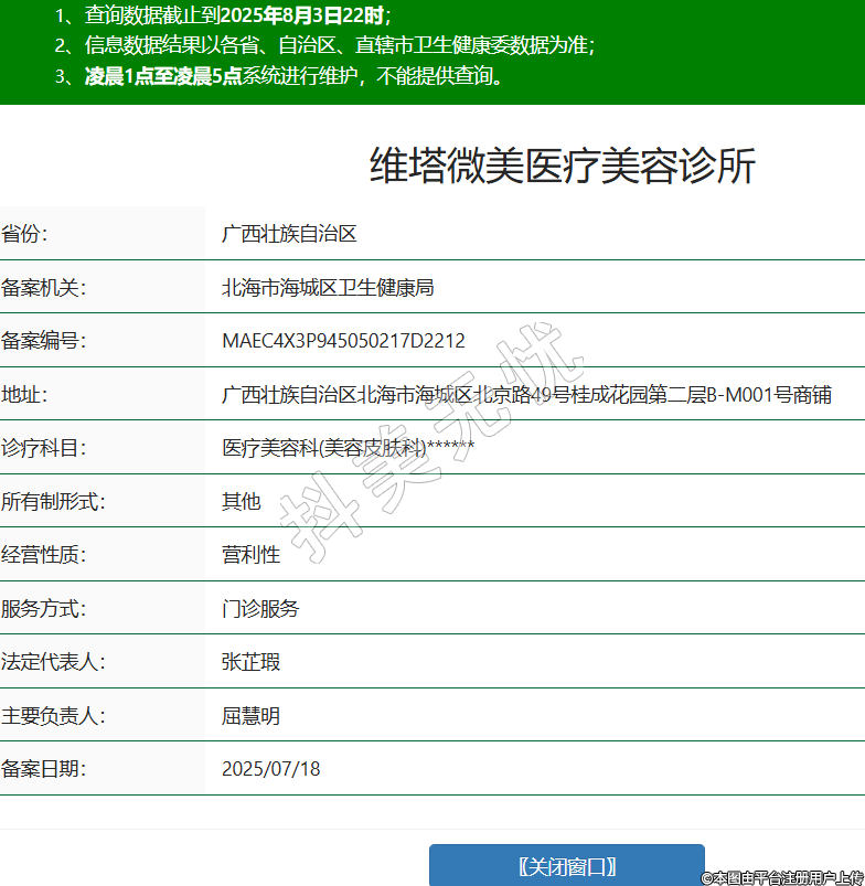 北海維塔微美醫(yī)療美容,診療科目:醫(yī)療美容科(美容皮膚科)******
