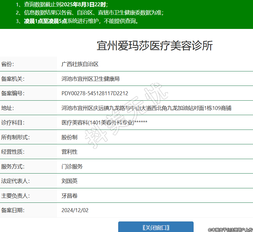 省份:廣西壯族自治區(qū)備案機關(guān):河池市宜州區(qū)衛(wèi)生健康局備案編號:PDY00278-545128117D2212地址:河池市宜州區(qū)慶遠鎮(zhèn)九龍路與中山大道西北角九龍加油站對面1棟109商鋪診療科目:醫(yī)療美容科(1401美容外科專業(yè))******所有制形式:股份制經(jīng)營性質(zhì):營利性服務(wù)方式:門診服務(wù)法定代表人:劉國英主要負責人:牙昌卷備案日期:2024/12/02 -
