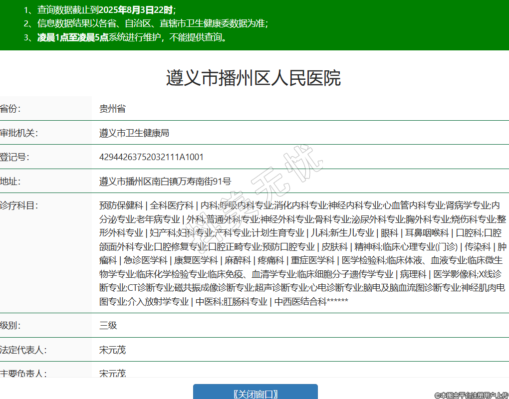 省份:貴州省審批機關(guān):遵義市衛(wèi)生健康局登記號:42944263752032111A1001地址:遵義市播州區(qū)南白鎮(zhèn)萬壽南街91號診療科目:預(yù)防保健科 | 全科醫(yī)療科 | 內(nèi)科;呼吸內(nèi)科專業(yè);消化內(nèi)科專業(yè);神經(jīng)內(nèi)科專業(yè);心血管內(nèi)科專業(yè);腎病學(xué)專業(yè);內(nèi)分泌專業(yè);老年病專業(yè) | 外科;普通外科專業(yè);神經(jīng)外科專業(yè);骨科專業(yè);泌尿外科專業(yè);胸外科專業(yè);燒傷科專業(yè);整形外科專業(yè) | 婦產(chǎn)科;婦科專業(yè);產(chǎn)科專業(yè);計劃生育專業(yè) | 兒科;新生兒專業(yè) | 眼科 | 耳鼻咽喉科 | 口腔科;口腔頜面外科專業(yè);口腔修復(fù)專業(yè);口腔正畸專業(yè);預(yù)防口腔專業(yè) | 皮膚科 | 精神科;臨床心理專業(yè)(門診) | 傳染科 | 腫瘤科 | 急診醫(yī)學(xué)科 | 康復(fù)醫(yī)學(xué)科 | 麻醉科 | 疼痛科 | 重癥醫(yī)學(xué)科 | 醫(yī)學(xué)檢驗科;臨床體液、血液專業(yè);臨床微生物學(xué)專業(yè);臨床化學(xué)檢驗專業(yè);臨床免疫、血清學(xué)專業(yè);臨床細胞分子遺傳學(xué)專業(yè) | 病理科 | 醫(yī)學(xué)影像科;X線診斷專業(yè);CT診斷專業(yè);磁共振成像診斷專業(yè);超聲診斷專業(yè);心電診斷專業(yè);腦電及腦血流圖診斷專業(yè);神經(jīng)肌肉電圖專業(yè);介入放射學(xué)專業(yè) | 中醫(yī)科;肛腸科專業(yè) | 中西醫(yī)結(jié)合科******級別:三級法定代表人:宋元茂主要負責(zé)人:宋元茂執(zhí)業(yè)許可證有效期:2025/02/01 -至- 2040/01/31 -