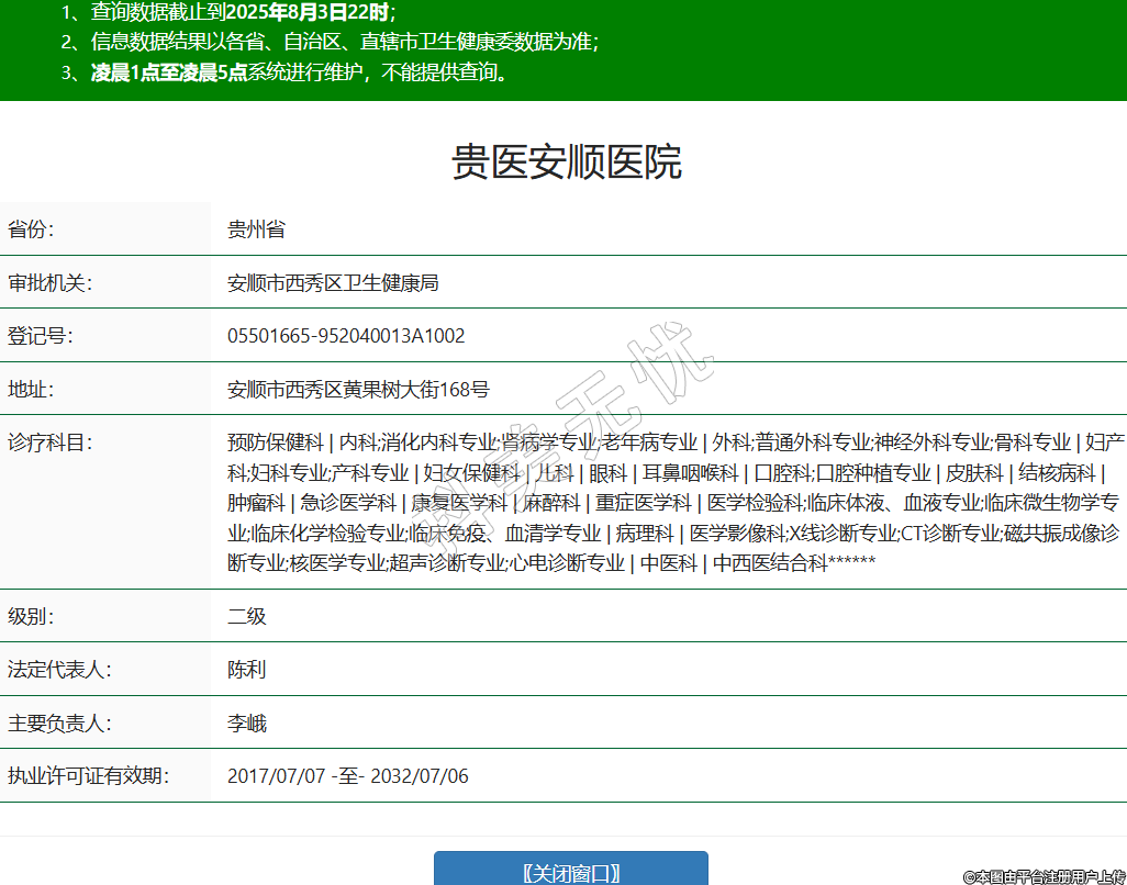 省份:貴州省審批機(jī)關(guān):安順市西秀區(qū)衛(wèi)生健康局登記號:05501665-952040013A1002地址:安順市西秀區(qū)黃果樹大街168號診療科目:預(yù)防保健科 | 內(nèi)科;消化內(nèi)科專業(yè);腎病學(xué)專業(yè);老年病專業(yè) | 外科;普通外科專業(yè);神經(jīng)外科專業(yè);骨科專業(yè) | 婦產(chǎn)科;婦科專業(yè);產(chǎn)科專業(yè) | 婦女保健科 | 兒科 | 眼科 | 耳鼻咽喉科 | 口腔科;口腔種植專業(yè) | 皮膚科 | 結(jié)核病科 | 腫瘤科 | 急診醫(yī)學(xué)科 | 康復(fù)醫(yī)學(xué)科 | 麻醉科 | 重癥醫(yī)學(xué)科 | 醫(yī)學(xué)檢驗(yàn)科;臨床體液、血液專業(yè);臨床微生物學(xué)專業(yè);臨床化學(xué)檢驗(yàn)專業(yè);臨床免疫、血清學(xué)專業(yè) | 病理科 | 醫(yī)學(xué)影像科;X線診斷專業(yè);CT診斷專業(yè);磁共振成像診斷專業(yè);核醫(yī)學(xué)專業(yè);超聲診斷專業(yè);心電診斷專業(yè) | 中醫(yī)科 | 中西醫(yī)結(jié)合科******級別:二級法定代表人:陳利主要負(fù)責(zé)人:李峨執(zhí)業(yè)許可證有效期:2017/07/07 -至- 2032/07/06 -