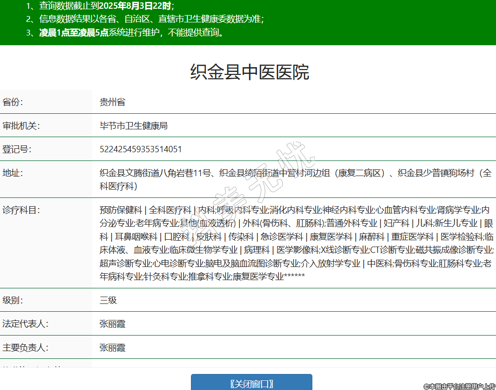 省份:貴州省審批機關:畢節(jié)市衛(wèi)生健康局登記號:522425459353514051地址:織金縣文騰街道八角巖巷11號、織金縣綺陌街道中營村河邊組(康復二病區(qū))、織金縣少普鎮(zhèn)狗場村(全科醫(yī)療科)診療科目:預防保健科 | 全科醫(yī)療科 | 內(nèi)科;呼吸內(nèi)科專業(yè);消化內(nèi)科專業(yè);神經(jīng)內(nèi)科專業(yè);心血管內(nèi)科專業(yè);腎病學專業(yè);內(nèi)分泌專業(yè);老年病專業(yè);其他(血液透析) | 外科(骨傷科、肛腸科);普通外科專業(yè) | 婦產(chǎn)科 | 兒科;新生兒專業(yè) | 眼科 | 耳鼻咽喉科 | 口腔科 | 皮膚科 | 傳染科 | 急診醫(yī)學科 | 康復醫(yī)學科 | 麻醉科 | 重癥醫(yī)學科 | 醫(yī)學檢驗科;臨床體液、血液專業(yè);臨床微生物學專業(yè) | 病理科 | 醫(yī)學影像科;X線診斷專業(yè);CT診斷專業(yè);磁共振成像診斷專業(yè);超聲診斷專業(yè);心電診斷專業(yè);腦電及腦血流圖診斷專業(yè);介入放射學專業(yè) | 中醫(yī)科;骨傷科專業(yè);肛腸科專業(yè);老年病科專業(yè);針灸科專業(yè);推拿科專業(yè);康復醫(yī)學專業(yè)******級別:三級法定代表人:張麗霞主要負責人:張麗霞執(zhí)業(yè)許可證有效期:2016/06/21 -至- 2030/10/28 -