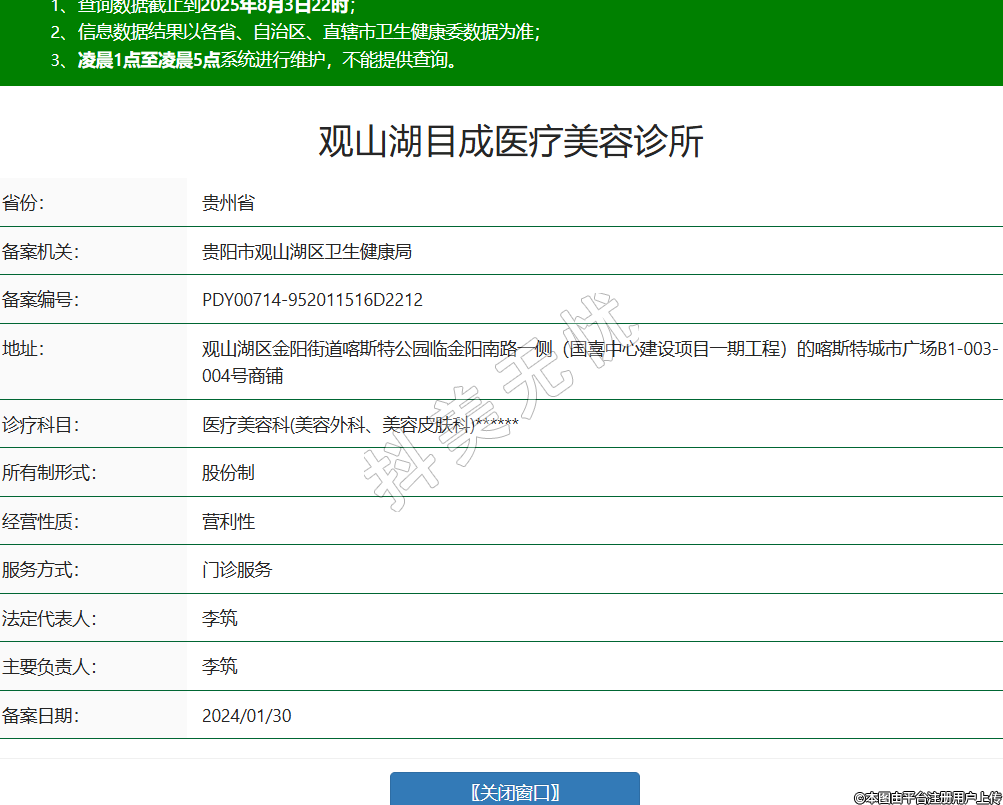 省份:貴州省備案機關(guān):貴陽市觀山湖區(qū)衛(wèi)生健康局備案編號:PDY00714-952011516D2212地址:觀山湖區(qū)金陽街道喀斯特公園臨金陽南路一側(cè)(國喜中心建設(shè)項目一期工程)的喀斯特城市廣場B1-003-004號商鋪診療科目:醫(yī)療美容科(美容外科、美容皮膚科)******所有制形式:股份制經(jīng)營性質(zhì):營利性服務(wù)方式:門診服務(wù)法定代表人:李筑主要負責人:李筑備案日期:2024/01/30 -
